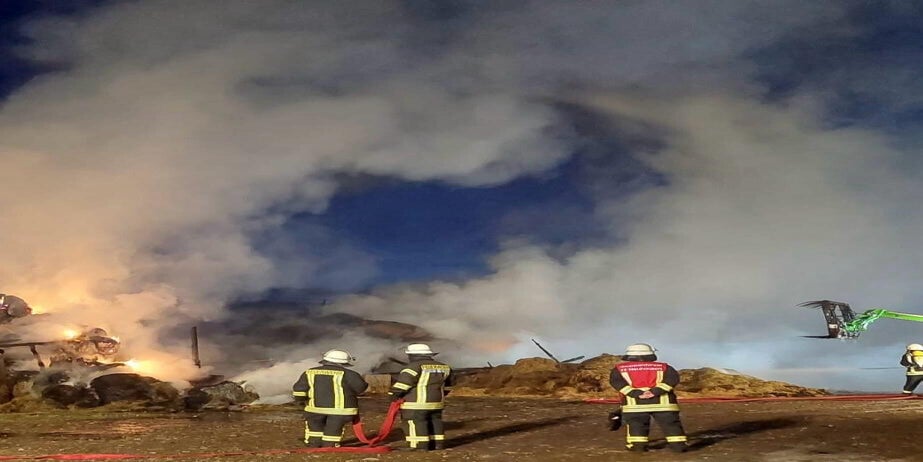 Vor Ort befand sich eine Lagerhalle mit Heu- und Strohballen in Vollbrand. Zu Beginn wurde die Nachbarhalle gekühlt da das Feuer überzugreifen drohte. Nachdem eine stabile Wasserversorgung aufgebaut wurde, konnten mehrere Trupps unter PA mit dem Löschen beginnen. Gemeinsam mit der Agrargenossenschaft wurden Stroh und Heu mittels eines Teleskopladers auseinandergezogen. Ein weiterer Teleskoplader sowie ein Radlader vom THW wurden nachgefordert. Mit mehreren Strahlrohren wurde das breitgezogene Brandgut bewässert, um die Glutnester zu löschen. Die Löscharbeiten dauerten, aufgrund der Masse von Heu- und Strohballen, sehr lange an. Erst gegen 5 Uhr am darauffolgenden Morgen waren wir wieder im Gerätehaus. Glücklicherweise wurde niemand bei dem Einsatz verletzt.
